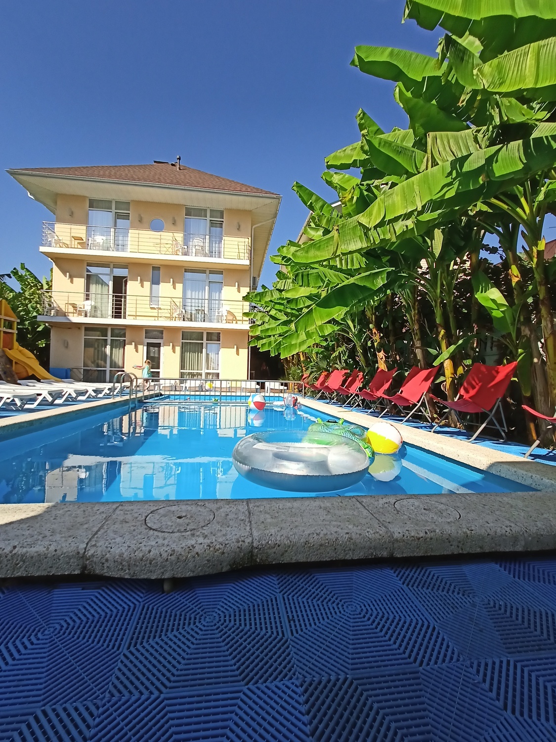 На территории отеля имеется детская площадка, бассейн с огороженной детской зоной, а также столики для приема пищи, и множество шезлонгов. Есть мангал, на котором можно самостоятельно приготовить шашлык. Расположение отеля очень удобное. В радиусе 100 метров есть несколько столовых, сетевые магазины «Пятерочка», «Магнит Косметик», рынок, аквапарк «Наутилус». В 200 метрах от отеля протекает горная река Псезуапсе. Дорога до моря ровная, без спусков и подъемов. Путь занимает порядка 20 минут.